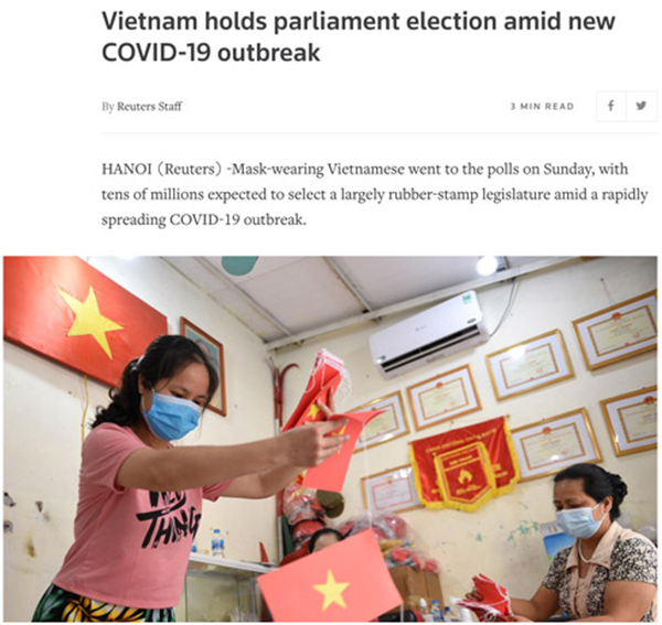 Theo Reuters (Anh), bất chấp dịch Covid-19 đang diễn biến phức tạp, hàng chục triệu người dân Việt Nam đã đeo khẩu trang đi bỏ phiếu trong ngày 23-5 để bầu ra những người tiêu biểu đại diện cho mình tham gia Quốc hội và HĐND các cấp. Hãng tin này ghi nhận các khu vực bỏ phiếu đều bảo đảm theo đúng phương án phòng, chống dịch. Thậm chí, hòm phiếu được khử khuẩn và đưa đến từng cử tri trong các khu cách ly tập trung.