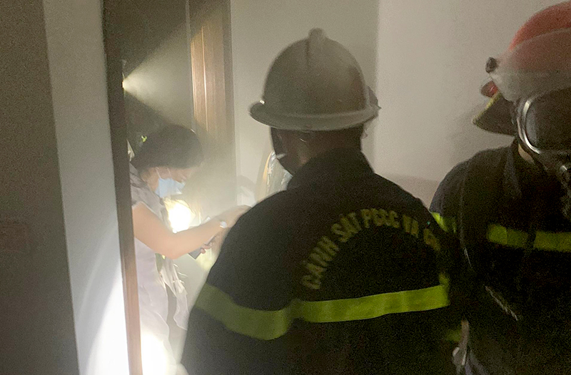 Tại hiện trường, phát hiện điểm cháy tại khu vực bếp của phòng 301, nằm tại tầng 3 của căn nhà, CBCS cùng người dân triển khai bình bột dập tắt đám cháy. Nhiều chiến sĩ đã không quản nguy hiểm đeo bình thở tiến vào cầu thang bộ, mở lối thoát khói, tiếp cận sân thượng hỗ trợ hướng dẫn 9 người trong nhà ra ngoài an toàn.