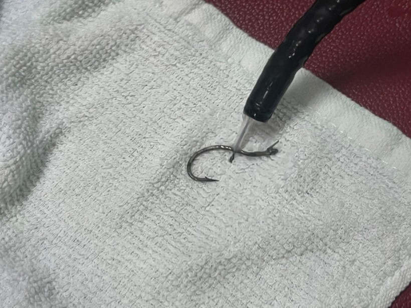 Kết quả, qua nội soi, các bác sĩ phát hiện dị vật nằm ở trong khu vực thực quản của bệnh nhân. Ngay sau đó, ê-kíp nội soi đã gắp ra ngoài dị vật là một chiếc lưỡi câu có chiều dài gần 4cm, vòng cung rộng gần 1,5cm.
