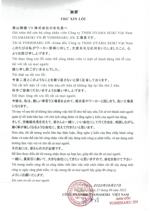 Cùng với đó, ông Yoshiharu Jin – Giám đốc công ty Iiyama Seiki - đã có thư xin lỗi bằng hai thứ tiếng là tiếng Việt và tiếng Nhật, gửi đến toàn thể công nhân công ty. Trong thư, ông Yoshiharu Jin nêu rõ: “Tôi thực lòng xin lỗi toàn thể công nhân viên vì một số hành vi thô lỗ của tôi với tất cả mọi người”.