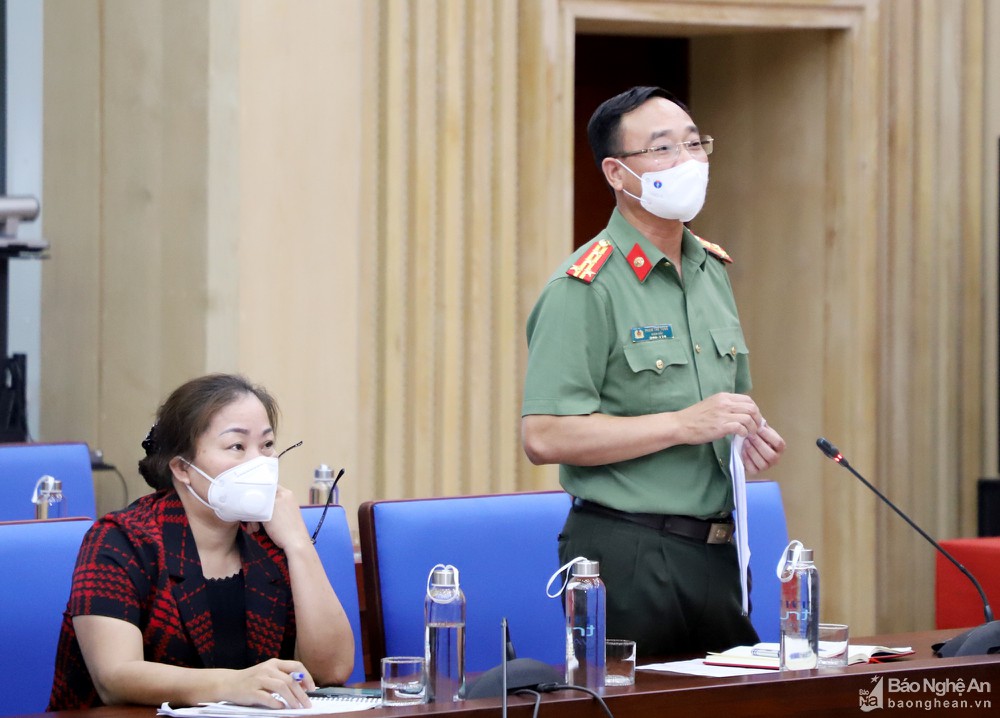 Đại tá Phạm Thế Tùng - Giám đốc Công an tỉnh phát biểu tại cuộc họp. Ảnh: Phạm Bằng