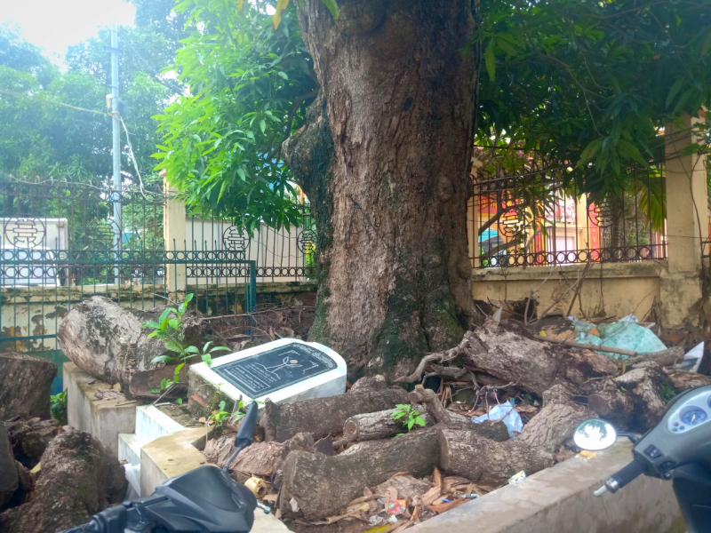 Biển cây di sản của đền Sóc nằm trong “khuôn viên” bãi xe Trung tâm đào tạo Lạc Hồng bị đổ nhưng không ai đoái hoài.