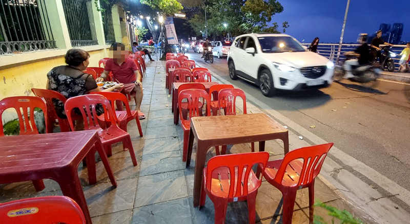 Ông Trần Nam Trung (ở phường Bưởi, quận Tây Hồ) chia sẻ: “Chiều nào chúng tôi cũng đi thể dục dọc ven hồ (phố Trích Sài). Nhiều đoạn vỉa hè hẹp nhưng bị một số cửa hàng kinh doanh ăn uống chiếm dụng. Họ không những chiếm vỉa hè trước cửa nhà mà còn sang vỉa hè ven hồ kê bàn ghế, xếp xe cho khách khiến người dân chúng tôi đi lại rất khó khăn”.