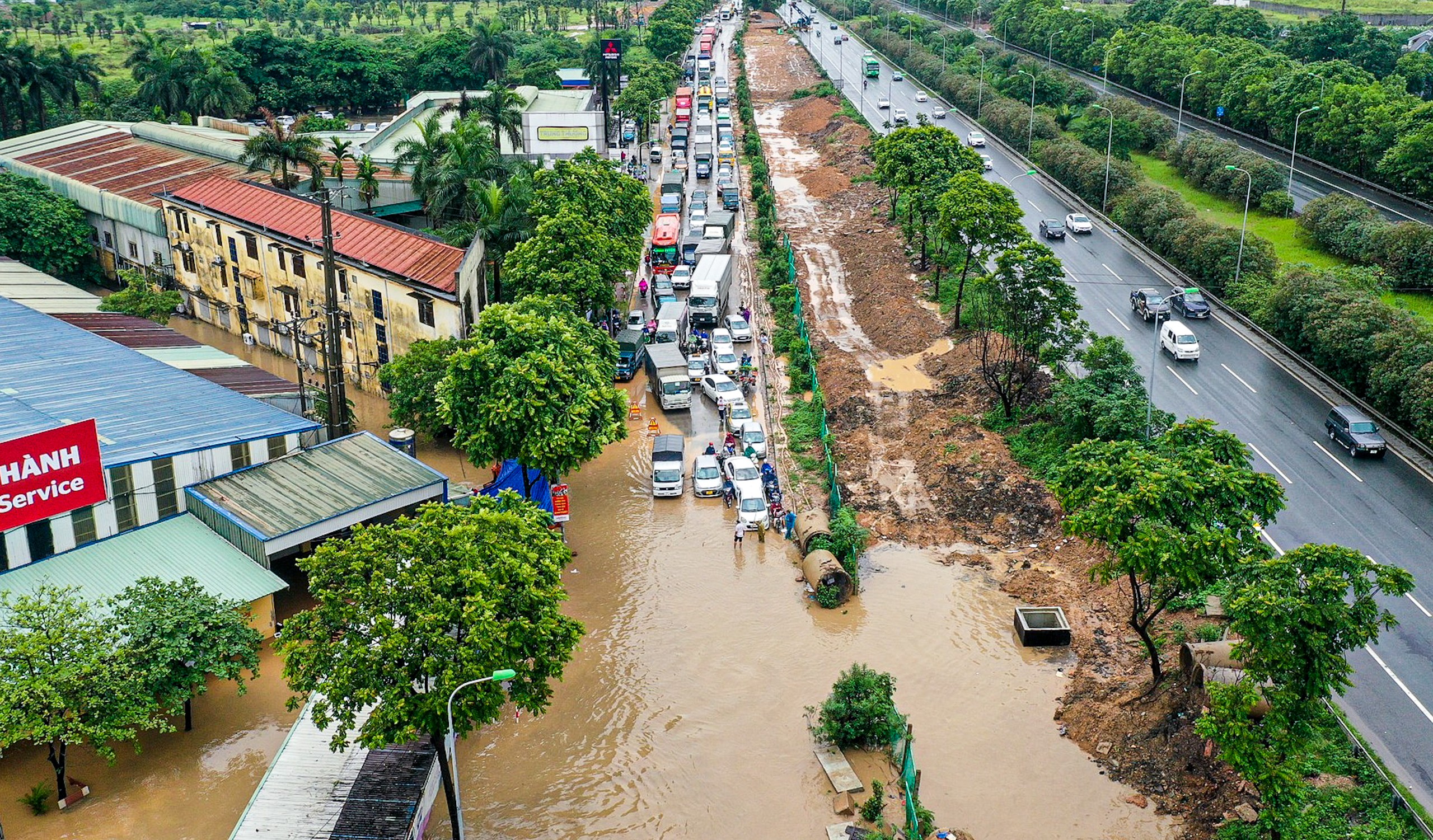 Tuyến đường gom đại lộ Thăng Long là nơi thường xuyên rơi vào cảnh ngập úng khi trời mưa lớn.
