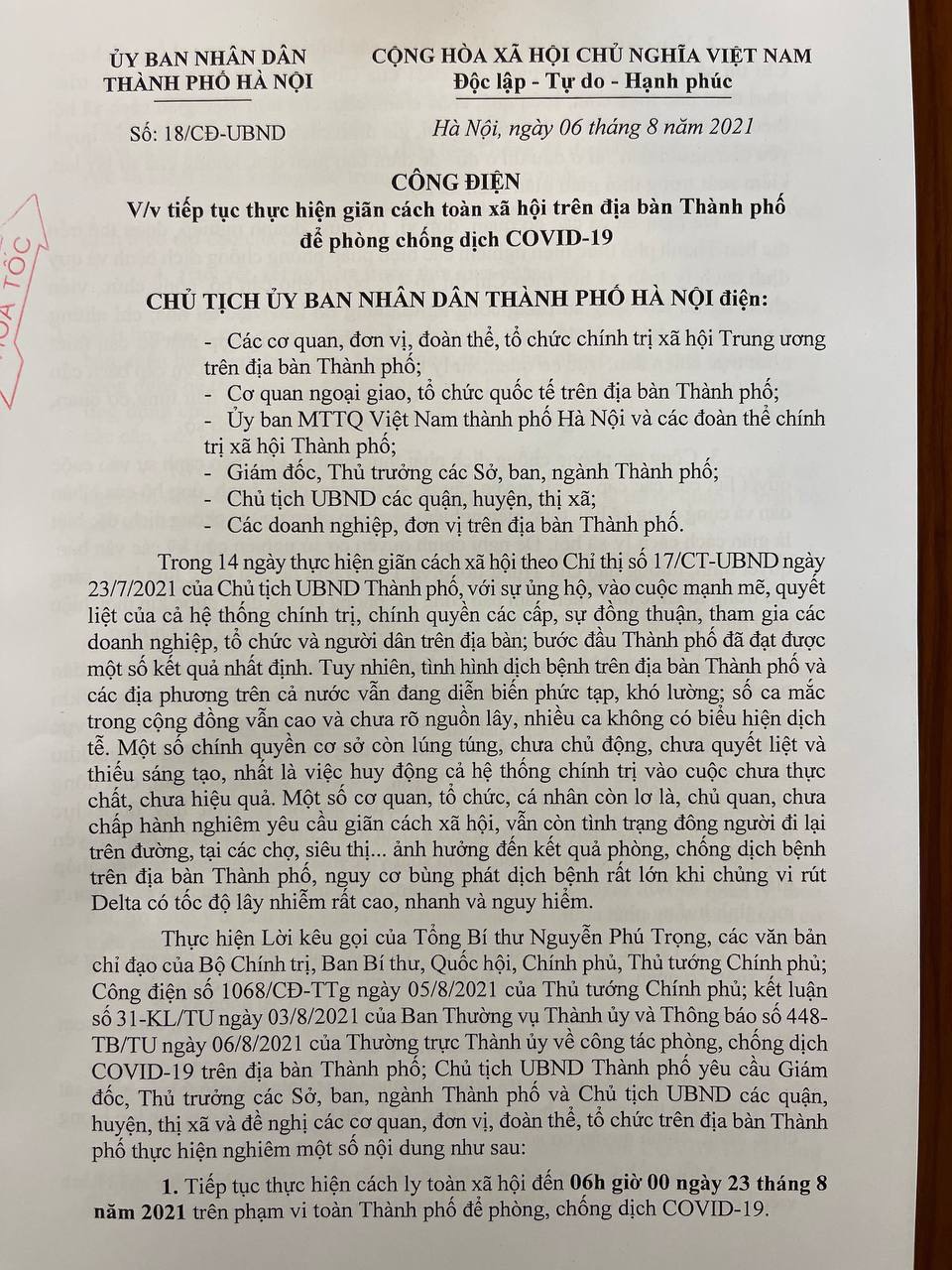 Thực hiện Lời kêu gọi của Tổng Bí thư Nguyễn Phú Trọng, các văn bản chỉ đạo của Bộ Chính trị, Ban Bí thư, Quốc hội, Chính phủ, Thủ tướng Chính phủ; Công điện số 1068/CĐ-TTg ngày 05/8/2021 của Thủ tướng Chính phủ; kết luận số 31-KL/TU ngày 03/8/2021 của Ban Thường vụ Thành ủy và Thông báo số 448-TB/TU ngày 06/8/2021 của Thường trực Thành ủy về công tác phòng, chống dịch COVID-19 trên địa bàn Thành phố; Chủ tịch UBND Thành phố yêu cầu Giám đốc, Thủ trưởng các Sở, ban, ngành Thành phố và Chủ tịch UBND các quận, huyện, thị xã và đề nghị các cơ quan, đơn vị, đoàn thể, tổ chức trên địa bàn Thành phố thực hiện nghiêm một số nội dung như sau: