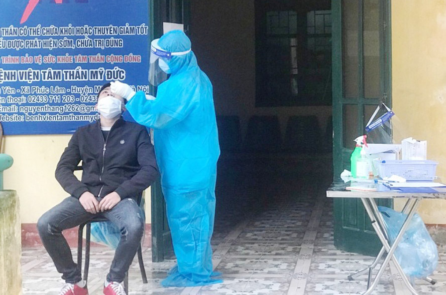 Lấy mẫu xét nghiệm cho người dân ở xã Tiến Thắng, huyện Mê Linh.