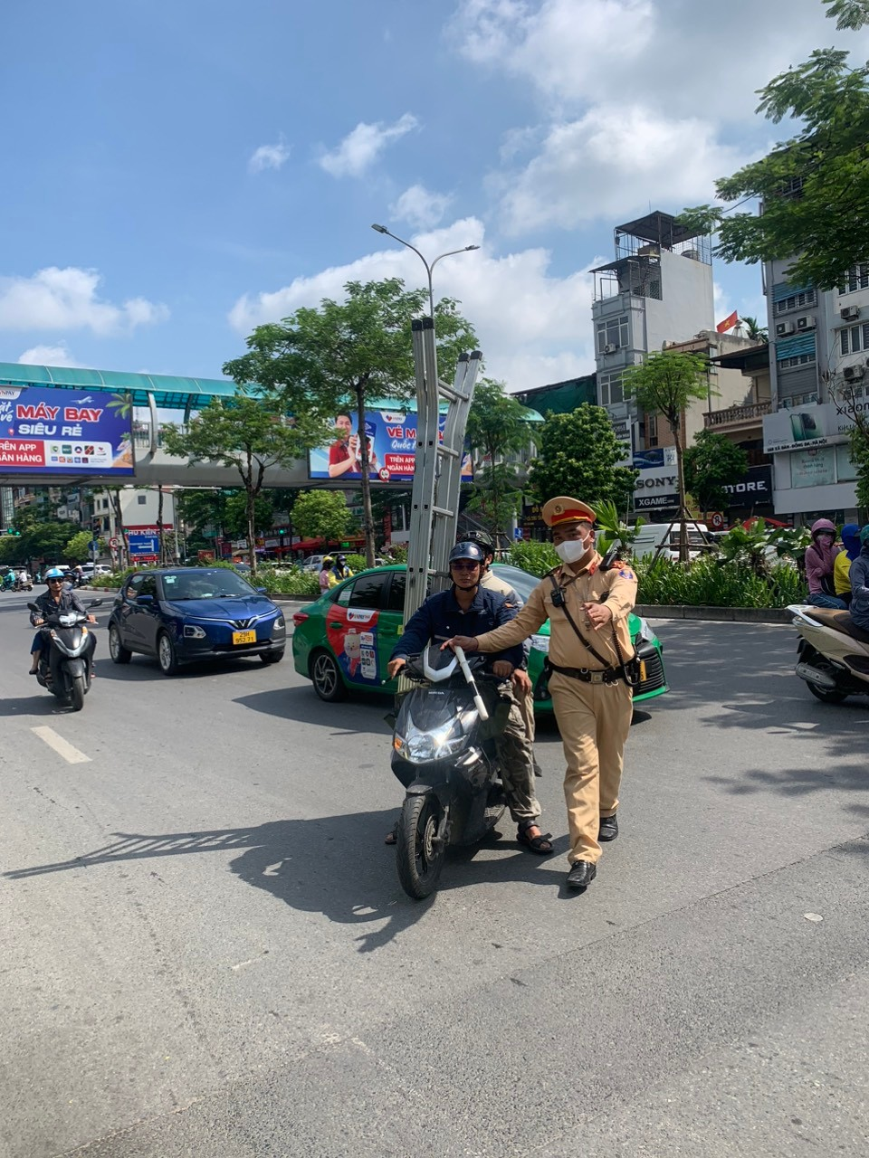 Tiếp đó, hồi 9h15' tại ngang số nhà 11 phố Xã Đàn (quận Đống Đa), tổ công tác tiếp tục phát hiện anh T.Q.V (sinh năm 1983, trú tại Đống Đa, Hà Nội) điều khiển xe mô tô BKS 30X1-27xx chở người ngồi trên xe mang theo 01 cây thang nhôm (cao khoảng 3m tính từ mặt đất) vi phạm TTATGT. Tổ công tác đã tiến hành kiểm tra, lập biên bản vi phạm hành chính và tạm giữ giấy phép lái xe của anh V để xử phạt.