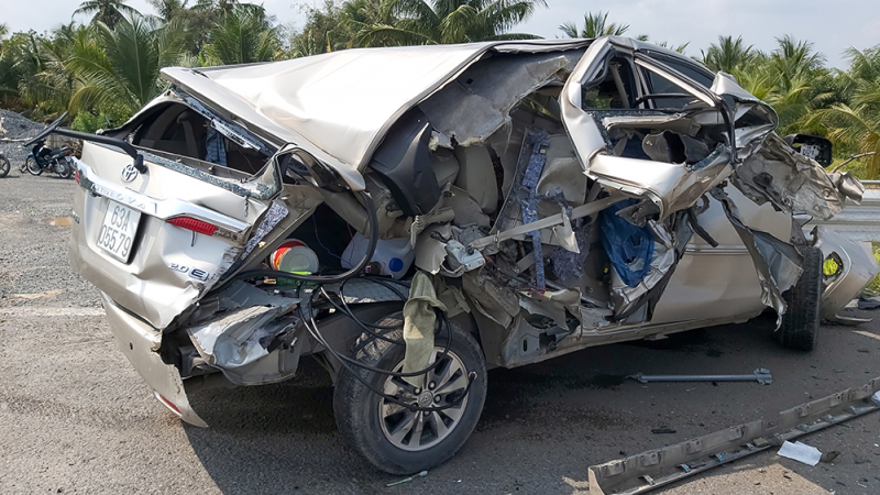 Tại hiện trường, phần đuôi và hông của chiếc xe con bị vỡ tung hư hỏng nặng, còn phần đầu thì đang ghim chặt vào dải ta-luy khiến chiếc xe bị méo mó. Ngoài ra, nhiều mảnh vỡ trên xe con cũng bị văng tung té hàng chục mét trên đường.