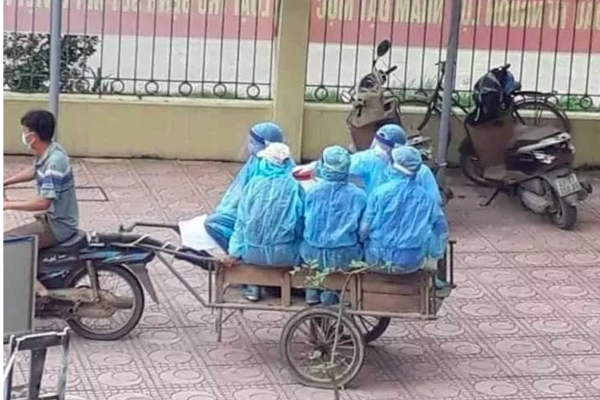Mới đây cư dân mạng chia sẻ bức ảnh nhóm thanh niên tình nguyện và bác sĩ xã Đồng Lạc (huyện Chương Mỹ, Hà Nội) trong bộ đồ bảo hộ ngồi ngay ngắn trên chiếc xe kéo cũ được nối với đuôi xe máy. Những người này chuẩn bị đi đến thôn Yên Lạc phun khử khuẩn, phát Cloramin B, và tuyên truyền cho người dân về cách phòng/chống dịch