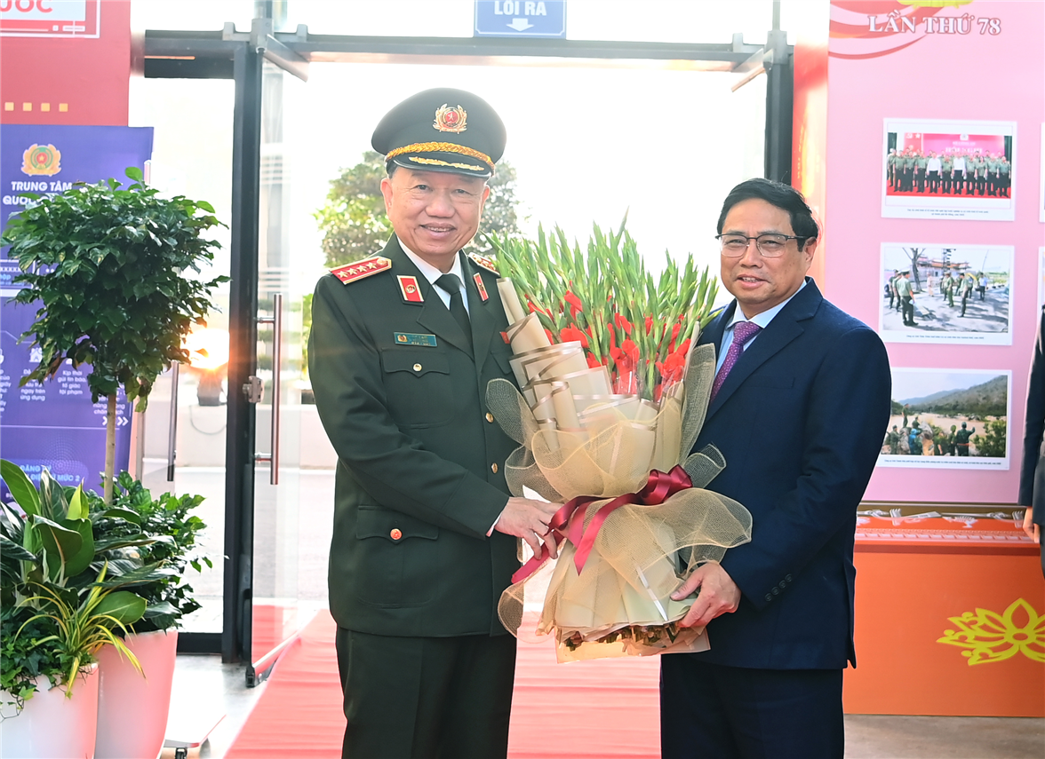 | Bộ trưởng Tô Lâm tặng hoa chào mừng Thủ tướng Chính phủ Phạm Minh Chính. |
