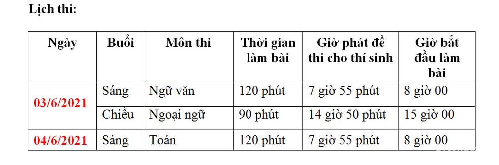 Lịch thi kỳ thi tuyển sinh vào lớp 10 năm học 2021 - 2022.
