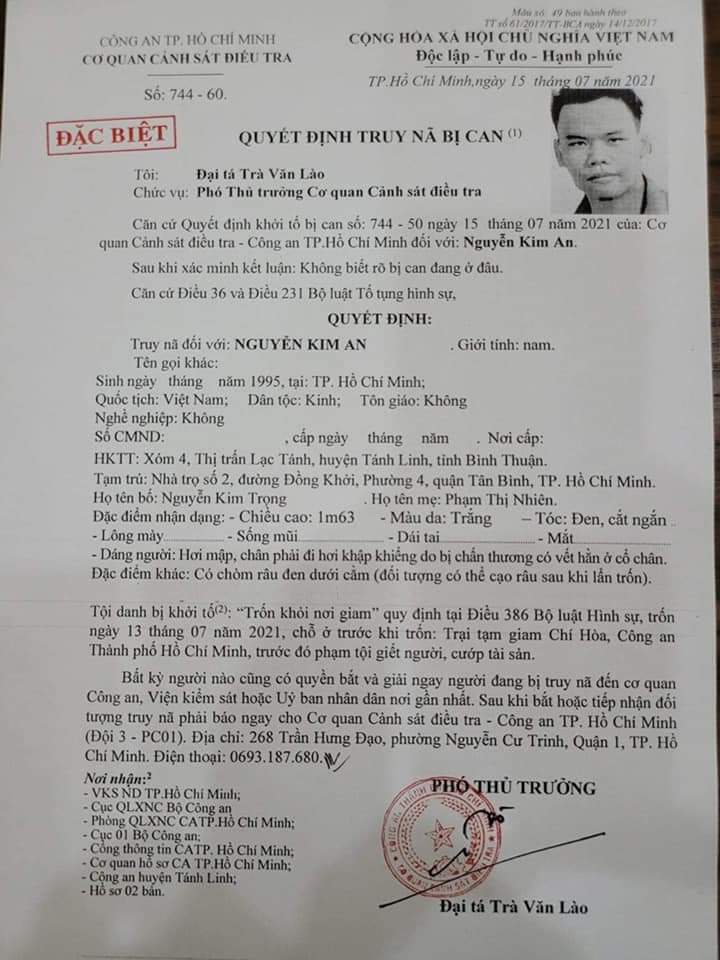 Theo đó, ngày 15-7, Phòng Cảnh sát hình sự Công an TPHCM đã gửi thông báo gửi đến Cục Cảnh sát hình sự và các cục nghiệp vụ Bộ Công an; Công an các tỉnh, thành; Công an các quận/huyện và TP.Thủ Đức tại TPHCM về việc phối hợp truy bắt một tử tù vừa trốn khỏi trại giam.