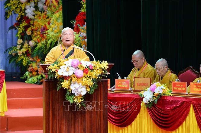 Hòa thượng Thích Thiện Nhơn, Chủ tịch Hội đồng trị sự Giáo hội Phật giáo Việt Nam đọc báo cáo Tổng kết công tác nhiệm kỳ 2017 - 2022 và Chương trình hoạt động Phật sự nhiệm kỳ IX (2022 - 2027) của Giáo hội.