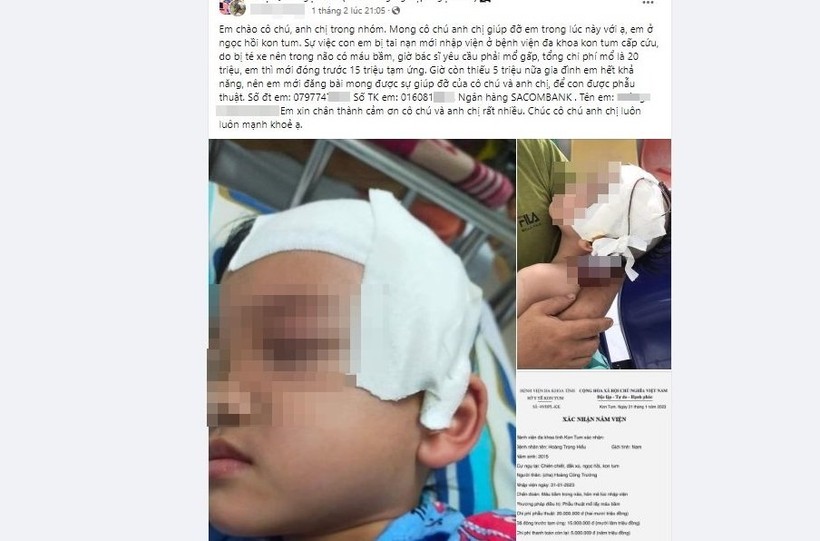 Cụ thể, mới đây nhất là vào ngày 1/2, tài khoản Facebook có tên T.C đã đăng tải trên nhiều hội nhóm với nội dung: “…Con em bị tai nạn mới nhập viện ở Bệnh viện đa khoa tỉnh Kon Tum cấp cứu do bị té xe nên trong não có máu bầm. Giờ bác sĩ yêu cầu phải mổ gấp. Tổng chi phí là 20 triệu, em chỉ mới đóng trước 15 triệu tạm ứng. Giờ còn thiếu 5 triệu nữa, gia đình em hết khả năng, nên em mới đăng bài mong được sự giúp đỡ của cô chú và anh chị để con em được phẫu thuật".