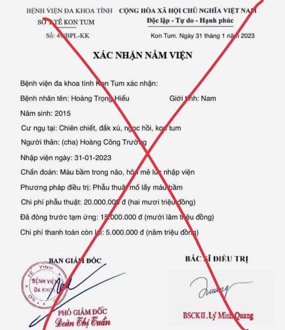 Tuy nhiên qua xác minh, Bệnh viện đa khoa tỉnh Kon Tum xác định nội dung và hình ảnh đăng tải trên là hoàn toàn sai sự thật. Bệnh viện đa khoa tỉnh Kon Tum không có trường hợp bệnh nhân nào như bài đăng và không thực hiện xác nhận nằm viện như hình ảnh.