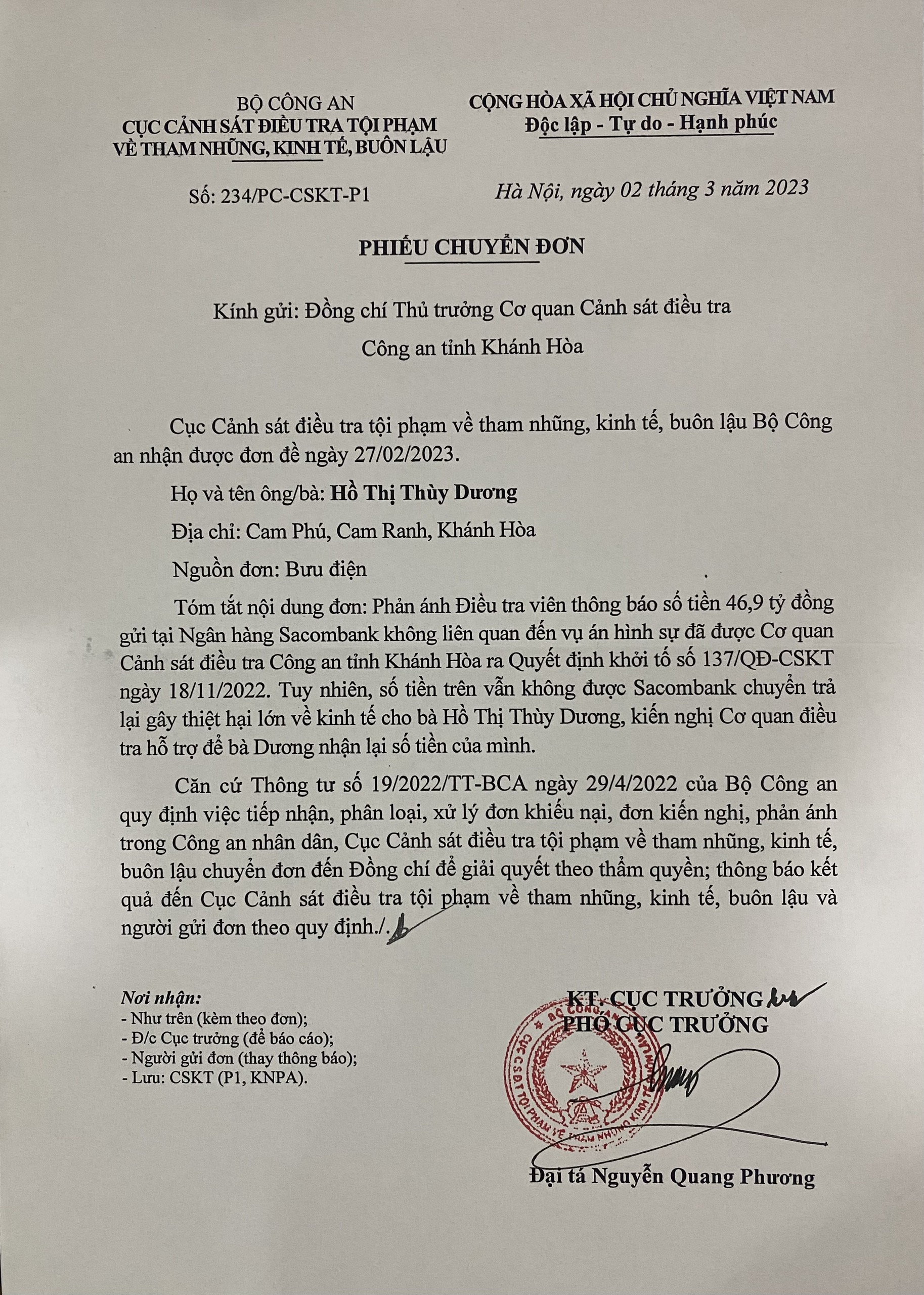 Tại Văn bản phúc đáp Văn bản kiến nghị ngày 16/1/2023 của bà Hồ Thị Thùy Dương, số 02/CV-SGL ngày 18/1/2023 do đại diện theo ủy quyền Công ty Luật TNHH Sài Gòn Công lý, do Giám đốc Luật sư Nguyễn Minh Luận đã ký, thì: Hồ sơ 12 giao dịch rút tiền từ ngày 4/5/2022 đến ngày 14/6/2022 với tổng số tiền 46,9 tỷ đồng của khách hàng Hồ Thị Thùy Dương tại Phòng giao dịch Cam Ranh đã được ngân hàng bàn giao cho cơ quan cảnh sát điều tra để làm rõ... Việc đòi ngân hàng hoàn trả 46,9 tỷ đồng trong khi sự việc chưa có kết luận của cơ quan cảnh sát điều tra là không hợp lý.