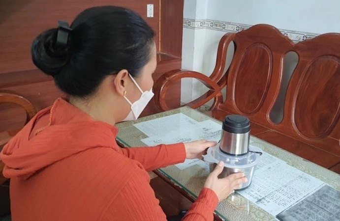 Bà N và máy xay thịt từ chương trình quà tặng tri ân. (Ảnh: Hoàng Thuận)