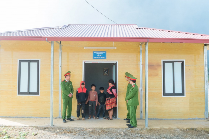 Công an xã Hang Kia đến thăm hộ gia đình chị Giàng Y Mo trên ngôi nhà tình nghĩa.