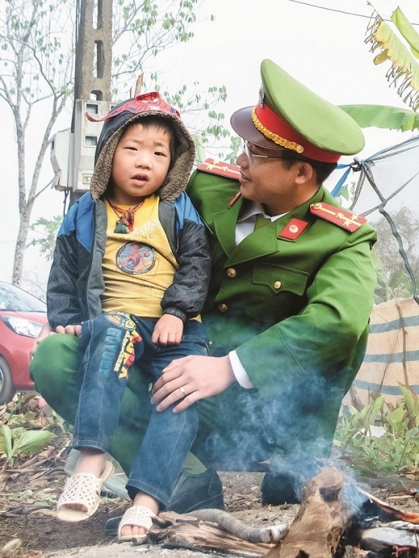 Công an xã Hang Kia bên cậu bé người dân tộc Mông.