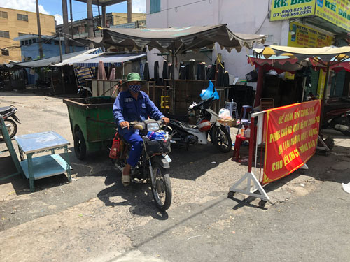 Người thu gom rác dân lập tiến hành lấy rác tại khu vực phong tỏa ở chung cư 155 Nguyễn Chí Thanh, quận 10, TP HCM