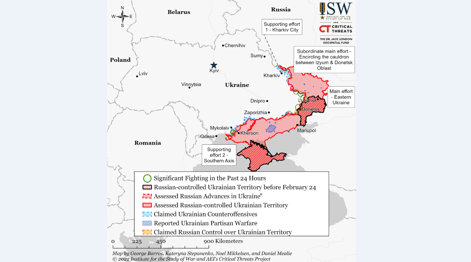 ISW dẫn báo cáo của Bộ Tổng tham mưu Ukraine cho biết, trên hướng Slovyansk, quân đội Nga đã cố gắng tiến quân từ các vị trí họ đang kiểm soát ở Pasika (cách Slovyansk 25 km về phía tây bắc) đến Dolyna (cách Slovyansk 18 km về phía tây bắc dọc theo đường cao tốc E40 Izyum-Slovyansk).