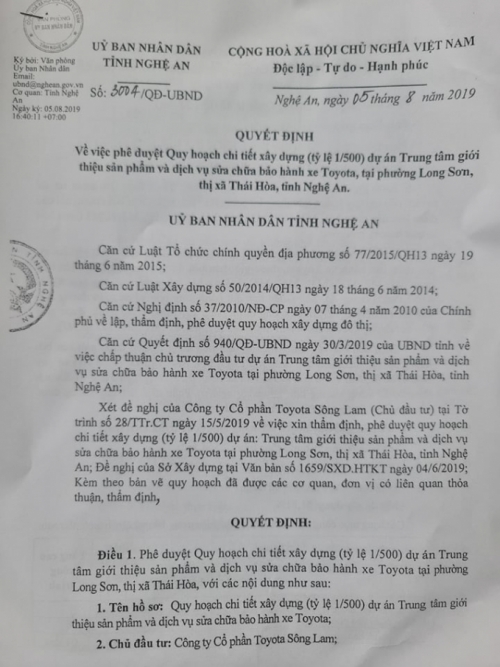 Vào tháng 3/2019, UBND tỉnh Nghệ An đã có Quyết định chấp thuận chủ trương đầu tư Dự án Trung tâm giới thiệu sản phẩm và dịch vụ sửa chữa bảo hành xe Toyota tại phường Long Sơn, TX Thái Hòa (Dự án Toyota Thái Hòa) do Công ty CP Toyota Sông Lam, có địa chỉ tại xã Nghi Phú, TP Vinh làm chủ đầu tư. Công ty CP Toyota Sông Lam do ông Phùng Bá Ngọc làm Người đại diện pháp luật và ông Nguyễn Đình Hy là Chủ tịch Hội đồng quản trị.