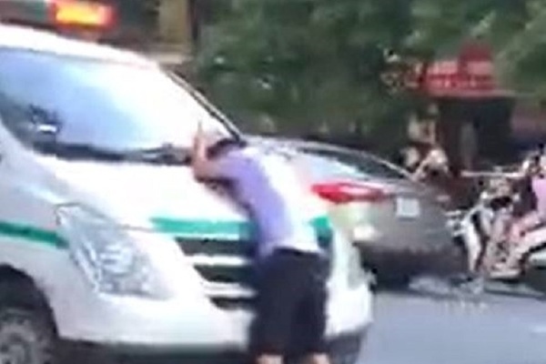 Điều đáng nói, khi một chiếc xe cấp cứu có mặt tại hiện trường để đưa người bị thương đi viện thì bị người đàn ông mặc áo tím chặn đầu xe hò hét, ngăn chặn.