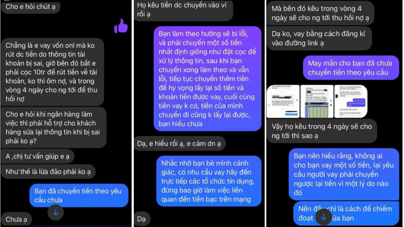Theo đó, người dân trình bày tài khoản Facebook cá nhân của mình có nhận được tin nhắn từ một đối tượng lạ với nội dung hỗ trợ vay tiền từ 30 – 200 triệu đồng, nhận tiền nhanh trong vòng 30 phút – 2 giờ đồng hồ và hồ sơ chỉ cần có CMND hoặc CCCD, đồng thời gửi kèm một đường link để đăng ký vay. Tin lời đối tượng, người này đã làm theo hướng dẫn, tuy nhiên sau đó đối tượng cho biết tiền đã vào tài khoản nhưng không rút ra được vì thông tin tài khoản bị sai, yêu cầu người này phải chuyển cọc 10 triệu đồng thì mới rút tiền về được, nếu không sẽ bị “ôm nợ” và trong vòng 4 ngày tới sẽ có người đến thu hồi nợ.