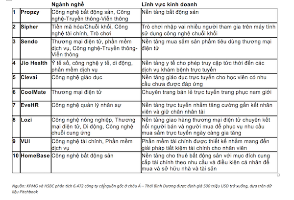 Trả lời báo giới, ông Nguyễn Trung Kiên, Giám đốc Khối Tư vấn Doanh nghiệp Tư nhân tại KPMG Việt Nam cho biết, nếu nhìn vào danh sách 10 start-up đang lên, bạn sẽ dễ dàng nhận thấy sự hiện diện đều của các lĩnh vực, từ tiền điện tử, thương mại điện tử, đến y tế, giáo dục, fintech và bất động sản. Tuy nhiên, tất cả các công ty này đều tận dụng những lợi thế của nền kinh tế kỹ thuật số đang bùng nổ và tìm cách nâng cao chất lượng cuộc sống của con người. Điều này được thấy không chỉ ở các start-up Việt Nam mà trên toàn khu vực.