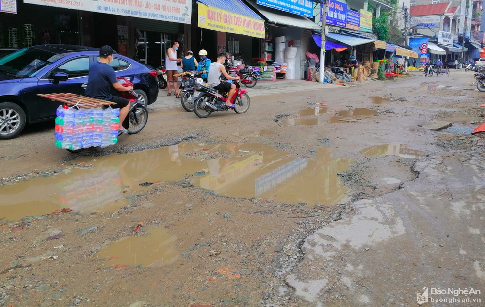 Tuyến đường Phạm Nguyễn Du, ngay sau chợ Vinh cũng bị xuống cấp nặng nề, lộ rõ sau mỗi đợt mưa lớn. Chị Nguyễn Thị Thanh, tiểu thương bán gần tuyến đường này cho biết: Mỗi lần mưa xuống, nhiều người đã bị ngã, xe cộ chết máy, hư hỏng khi đi qua đây. Bà con tiểu thương đã từng góp tiền đổ đất, cát để đắp vào những chỗ sụt lún nhưng không xuể.