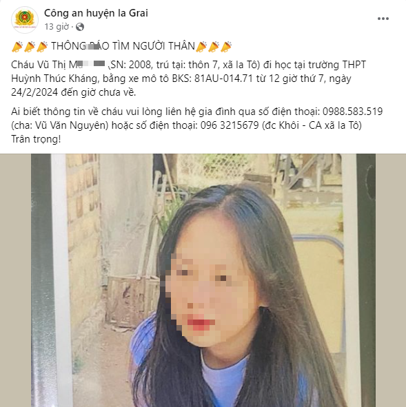 Trước đó, Công an huyện Ia Grai (tỉnh Gia Lai) đã đăng tải thông tin tìm kiếm nữ sinh L. (SN: 2008, trú tại: thôn 7, xã Ia Tô) đi học tại trường THPT Huỳnh Thúc Kháng, bằng xe mô tô BKS: 81AU-014.71 từ 12 giờ thứ 7, ngày 24/2/2024 đến giờ chưa về.