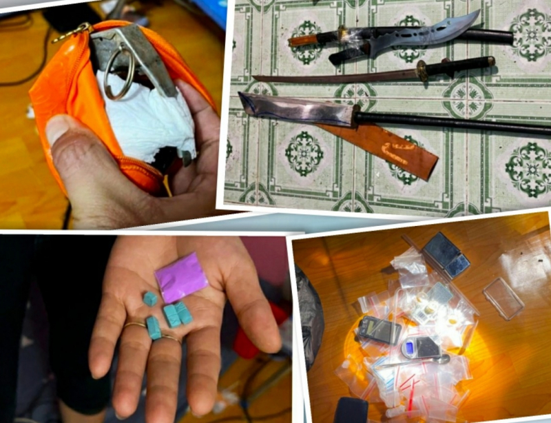 Lựu đạn, mã tấu, kiếm Nhật, đao và ma túy thu từ các đối tượng.