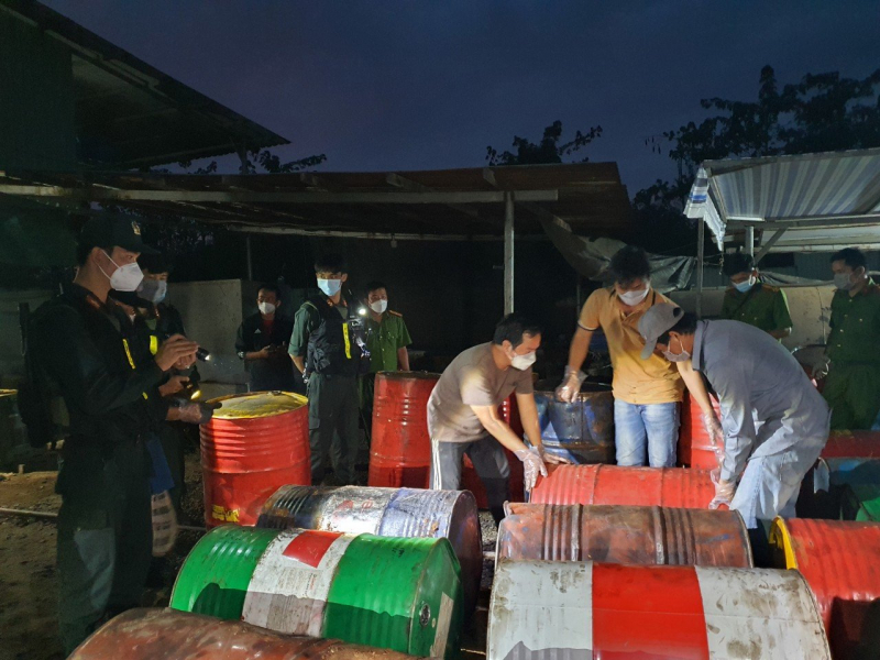 Công an phát hiện có 9 người bên trong cơ sở đang tiến hành chưng cất, đốt lò nấu dầu nhớt thải, bơm hút dầu nhớt thành phẩm lên xe bồn chở xăng dầu dung tích 16.000 lít, BKS 60C-354.22; 1 xe tải có cẩu BKS 60C261.93 chở các bao hóa chất ghi trên bao bì là SILICA GEL (xuất xứ Trung Quốc); 1 xe ô tô tải BKS 50H-090.08 chở 30 thùng phuy loại 200 lít dầu nhớt thải đến nơi tiêu thụ.