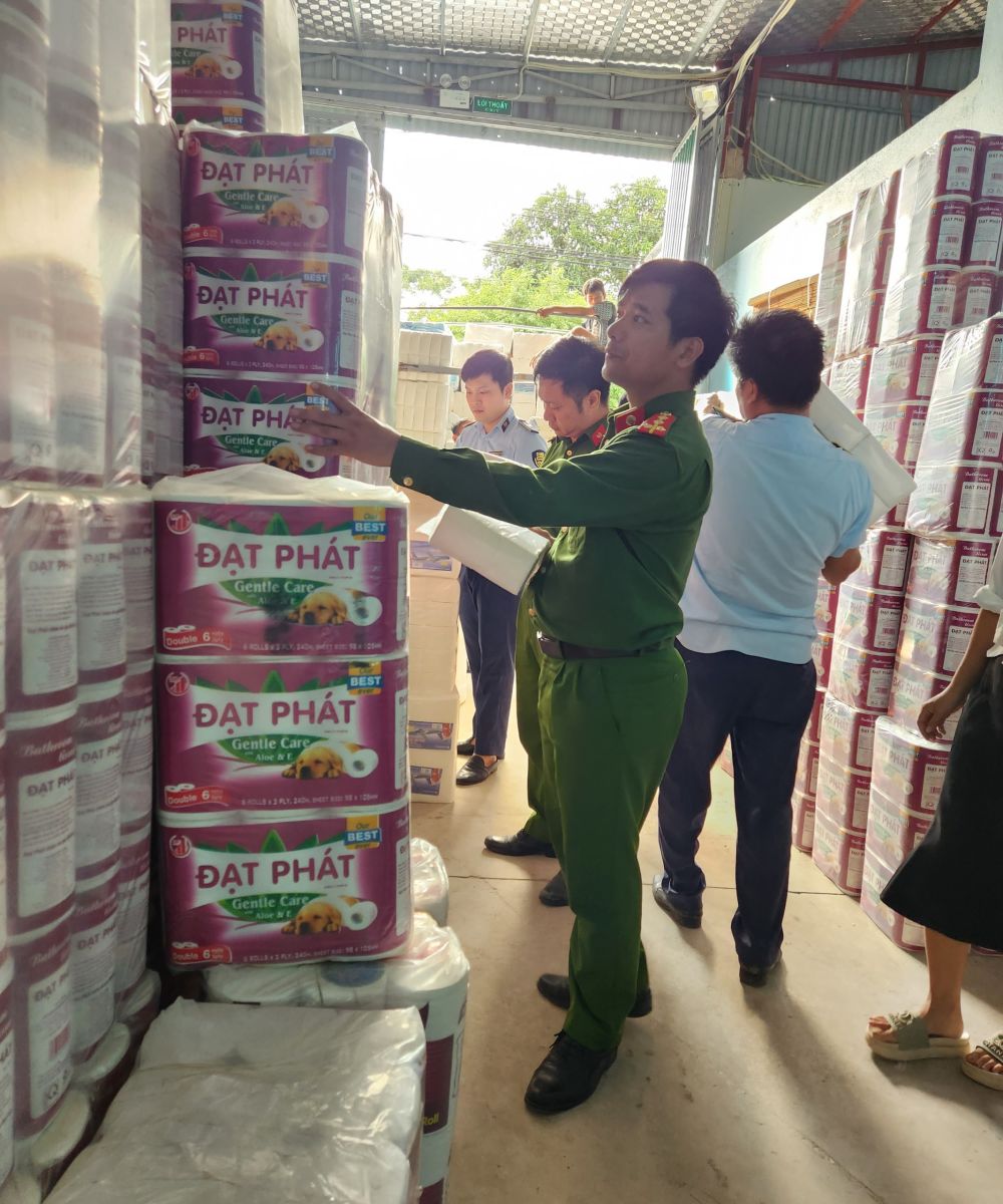 Đoàn kiểm tra đã tiến hành lập biên bản niêm phong tạm giữ toàn bộ số hàng hóa có dấu hiệu vi phạm nói trên gồm: 14.300 cuộn và 840 túi giấy vệ sinh Vietnam Arilines, HaNoi Silk, Hai Hoa; 720 túi khăn giấy Napkin; 110 kg bao bì đựng nhãn Vietnam Arilines và hàng không; 12 kg cuộn giấy trắng….