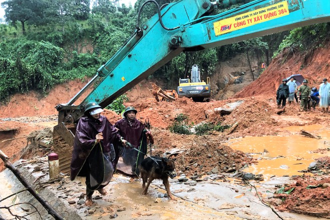 HLV Trường 24 điều khiển chó nghiệp vụ tìm kiếm người mất tích tại hiện trường vụ sạt lở núi Trà Leng (H.Nam Trà My,