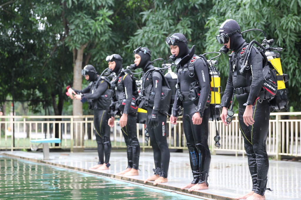 Thành viên Tổ Cảnh sát chữa cháy và cứu nạn, cứu hộ đặc biệt tinh nhuệ dưới nước diễn tập tình huống cứu nạn, cứu hộ