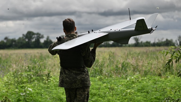 Một quân nhân Ukraine thuộc đội trinh sát trên không thuộc Lữ đoàn 45 chuẩn bị phóng UAV trinh sát Leleka vào một vị trí ở khu vực Donetsk. (Ảnh: Genya SAVILOV / AFP)