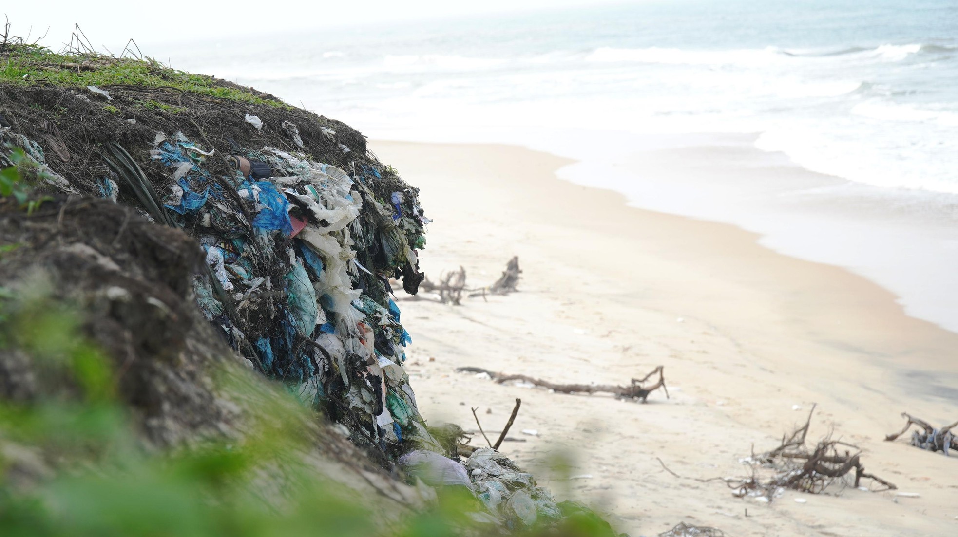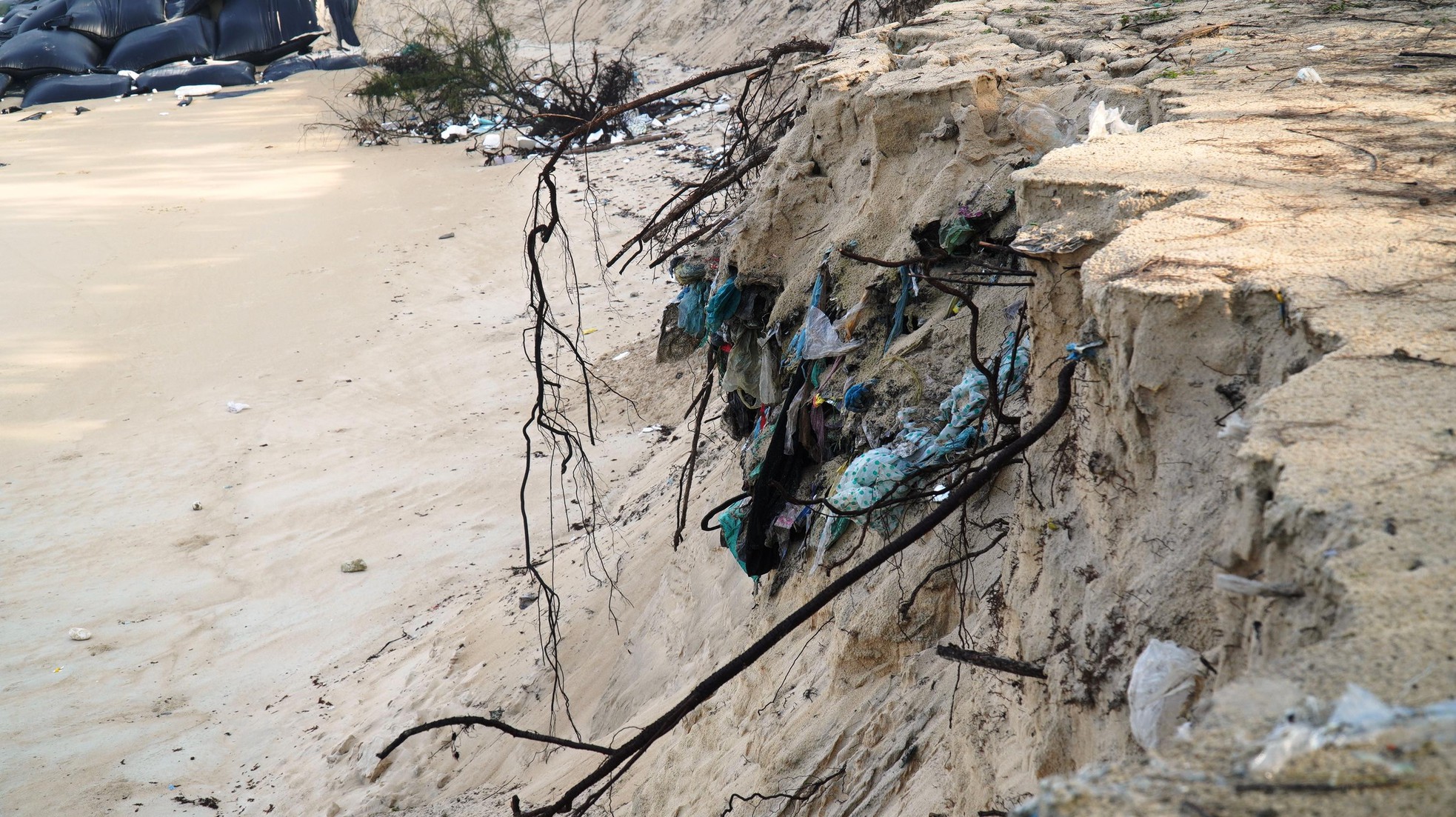 Rùng mình bãi chôn lấp rác thải cũ bỗng lộ thiên ‘treo’ lơ lửng bên bờ biển