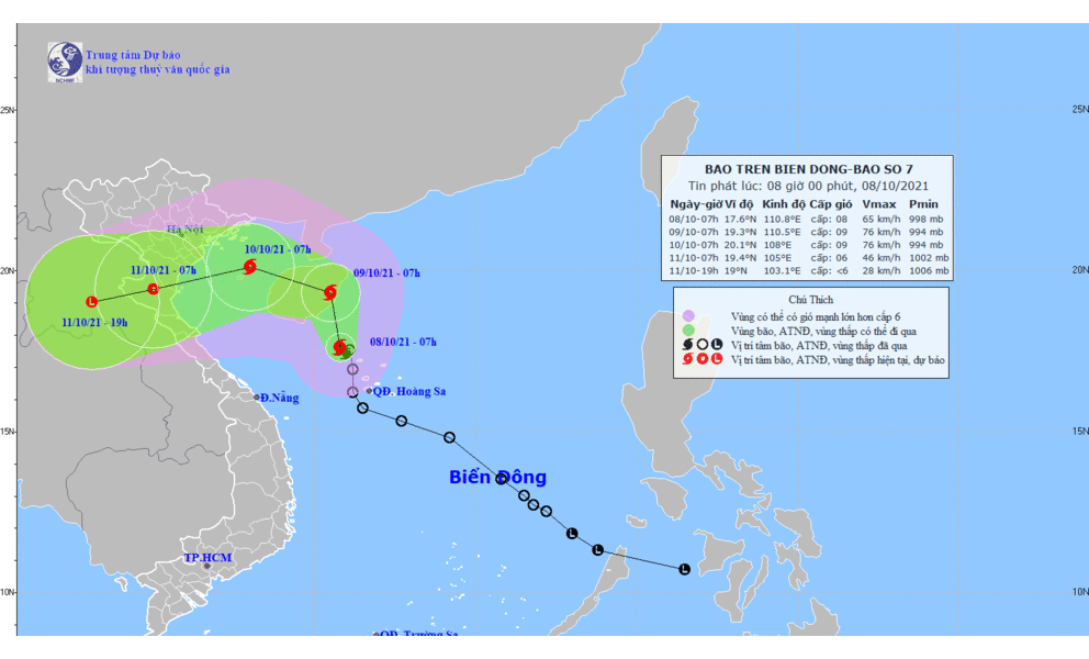 Theo Trung tâm Dự báo Khí tượng Thủy văn Quốc gia, vào hồi 7h ngày 8/10, vị trí tâm bão ở vào khoảng 17,6 độ vĩ bắc; 110,8 độ kinh đông, ngay trên vùng biển phía tây bắc quần đảo Hoàng Sa. Sức gió mạnh nhất vùng gần tâm bão mạnh cấp 8 (60-75km/giờ), giật cấp 10. Bán kính gió mạnh cấp 6, giật cấp 8 khoảng 120km tính từ tâm bão.