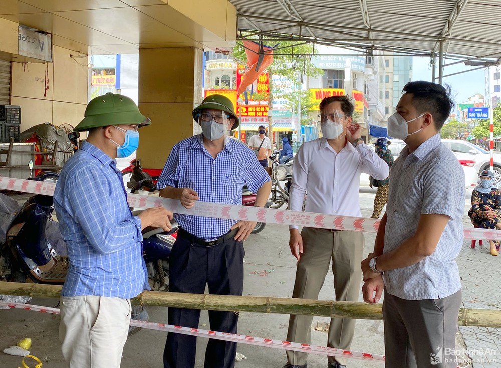 Đồng chí Trần Quang Lâm - Phó Chủ tịch UBND TP.Vinh có mặt tại hiện trường để chỉ đạo công tác phòng chống dịch. Trước mắt, 2 khu chợ sẽ được phun khử trùng đồng thời sẽ nhanh chóng lấy mẫu xét nghiệm cho toàn bộ tiểu thương trong khu vực cần kiểm soát, tạm dừng hoạt động. Ảnh: Quang