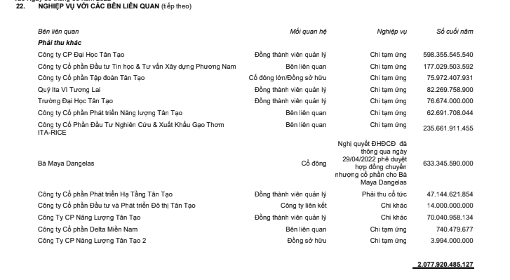 Theo báo cáo tài chính công bố cuối tháng 7, Tân Tạo tạm ứng cho bà Yến 1.936 tỷ đồng để tham gia dự án ở Mỹ. Công ty trước đso cũng chi cho mục đích tương tự song số tiền chỉ vài chục tỷ đồng. Cụ thể, Tân Tạo bắt đầu chi tạm ứng trên cho dự án tại Mỹ vào cuối năm 2020 với số tiền 14 tỷ đồng, đến cuối năm 2021 là 59 tỷ. Tới cuối quý I, số dư là 63 tỷ đồng. Như vậy, con số chi ra là khoản phát sinh tăng đột biến trong quý II.