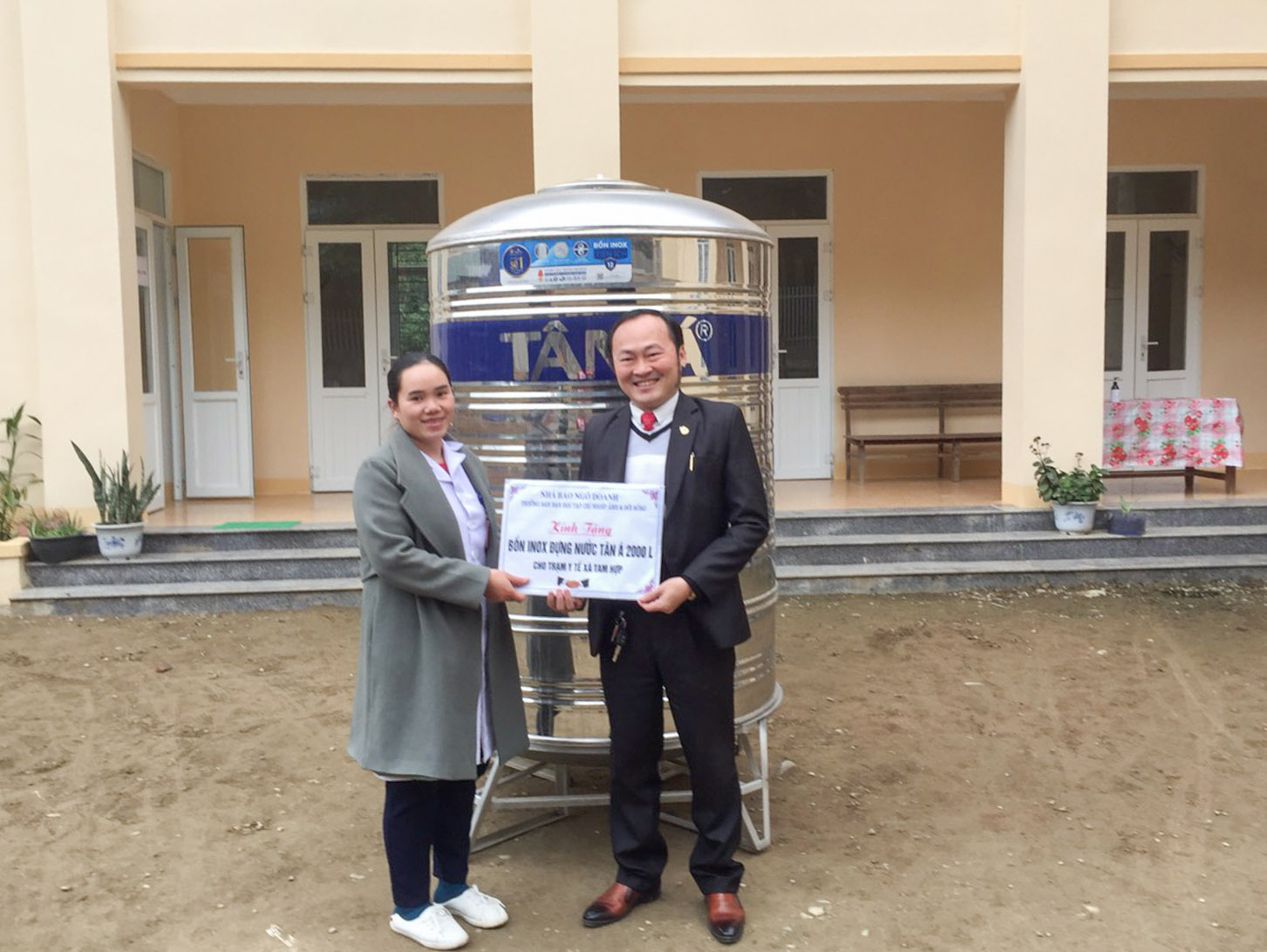 Đoàn công tác tiếp tục chương trình trao tặng quà là 01 bồn chứa nước inox dung tích 2000 lít trị giá 4,7 triệu đồng cho Trạm y tế xã Tam Hợp trích từ sự tài trợ cá nhân của Nhà báo Ngô Doanh.