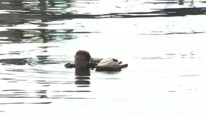 Hình ảnh người phụ nữ đang bơi về bờ sau khi nhảy khỏi tàu thoát thân. Ảnh: Boston25News