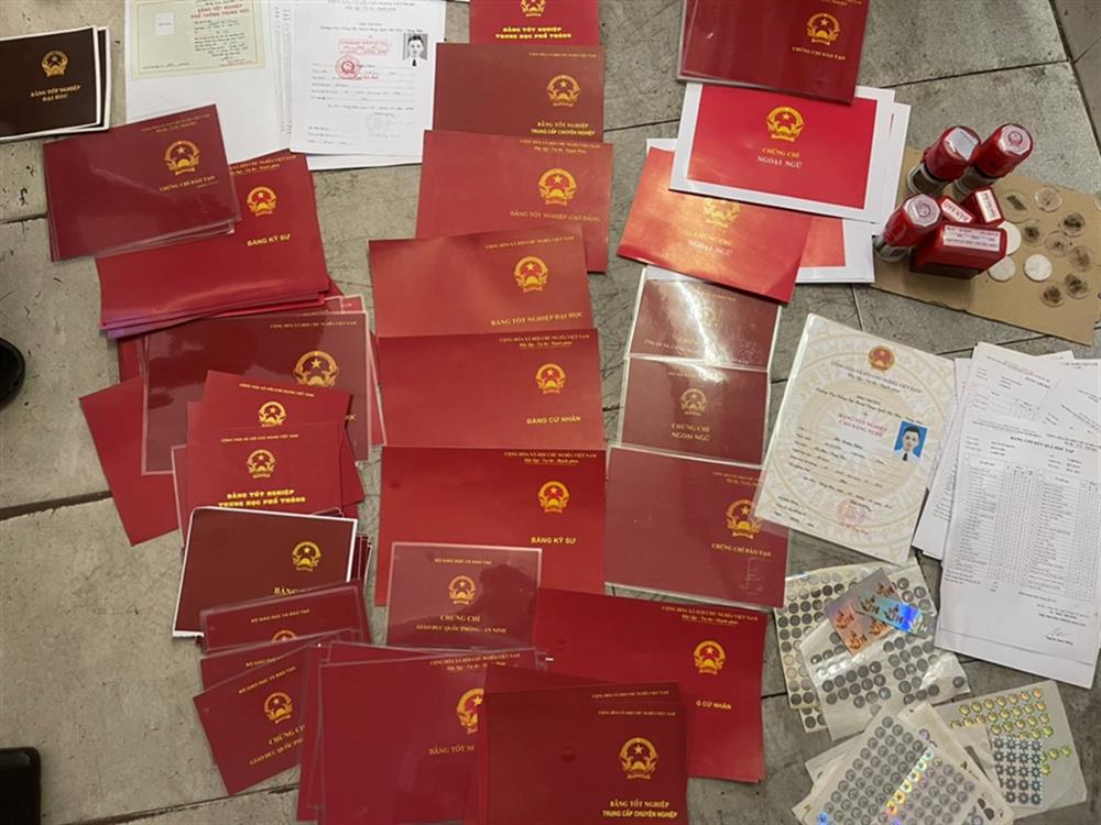 Tiến hành khám xét khẩn cấp nơi làm việc và nơi ở của các đối tượng, cơ quan Công an thu giữ 02 máy tính xách tay, 07 điện thoại di động, 02 máy in màu. 18 con dấu cùng nhiều giấy tờ, văn bằng, tài liệu giả của cơ quan Nhà nước.