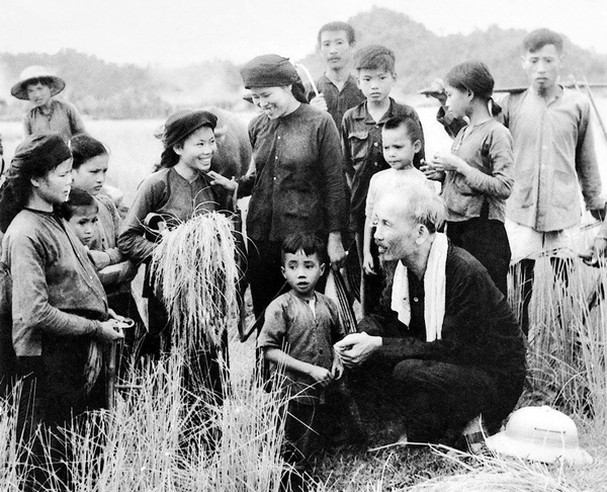 Chủ tịch Hồ Chí Minh thăm hỏi nông dân Hợp tác xã Hùng Sơn (huyện Đại Từ, tỉnh Thái Nguyên) đang gặt lúa, năm 1954.