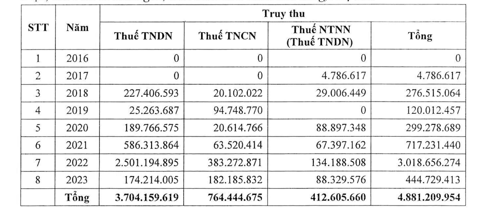 Chi tiết số tiền thuế bị truy thu từ năm 2017-2023.