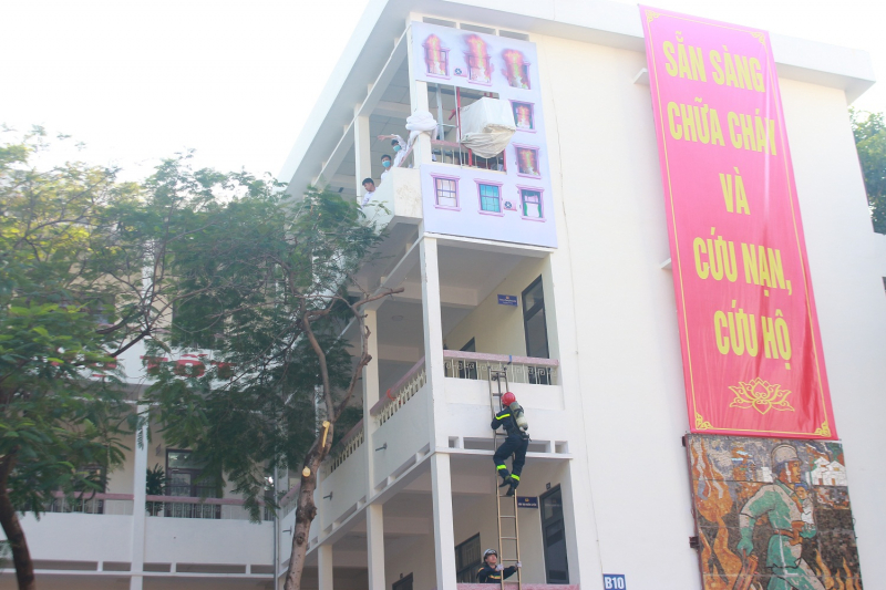 Tình huống 1: CNCH khi cháy tổ hợp nhà cao tầng; cứu người bị nạn bị cô lập do mưa lũ. Theo đó, xảy ra cháy tại tòa chung cư B10 và B8, quận 1, TP Đông Hà, tỉnh Quảng Trị. Nguyên nhân do mưa lớn kèm theo dông bão, sét đánh làm hư hỏng hệ thống đường ống dẫn gas, dẫn đến sự cố cháy, nổ; tạo nhiều khói, khí độc bao phủ lối thoát nạnoà tn bộ hành lang tầng 2 tòa B10... Sau đó, khói lan lên các tầng phía trên thông qua hệ thống cầu thang bộ, các tầng phía trên bị nhiễm khói cản trở việc thoát nạn… Tại thời điểm xảy ra sự cố cháy có khoảng 50 người bị mắc kẹt trong tòa nhà B10 và B8…
