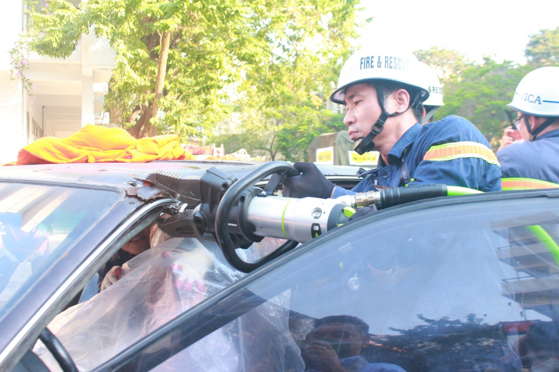 Tình huống 2: CNCH sự cố, tai nạn giao thông liên hoàn; cứu người bị nạn mắc kẹt, xử lý hóa chất phát tán; chữa cháy xe chở chất lỏng cháy. Theo đó, xảy ra sự cố tai nạn giao thông nghiêm trọng. Nguyên nhân do thời tiết xấu, mưa kéo dài trong nhiều ngày trời âm u có nhiều sương mù tầm nhìn của lái xe tham gia giao thông trên đường bị hạn chế. Trong quá trình tham gia giao thông do không làm chủ được tốc độ, đường trơn trượt dẫn đến xe ô tô con va chạm với xe khách dẫn đến tai nạn 4 xe ô tô liên hoàn…