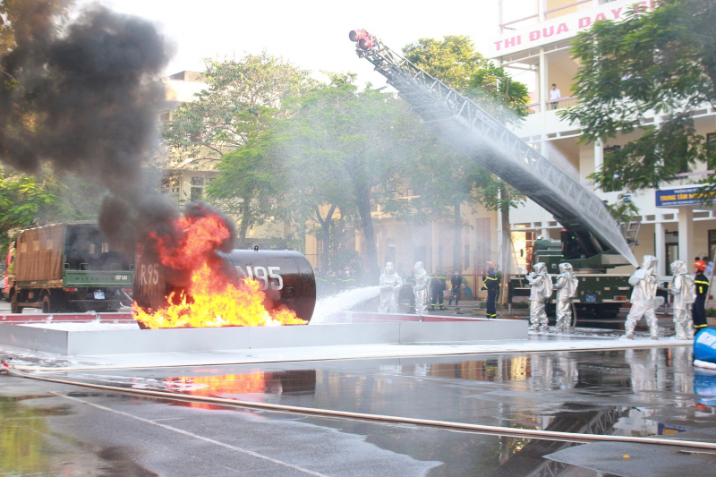 Tại buổi diễn tập, hơn 100 cán bộ, chiến sĩ của Trường Đại học PCCC đã tham gia diễn tập phương án gồm 2 tình huống liên hoàn, phức tạp.