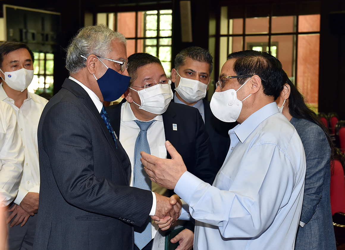 | Thủ tướng trao đổi với ông Kamal Malhotra, Điều phối viên Thường trú Liên Hợp Quốc tại Việt Nam về vấn đề vaccine tại Việt Nam. Ảnh: VGP/Nhật Bắc |